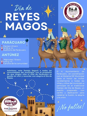 Parácuaro, Michoacán, a 04 de Enero del 2026.- El H. Ayuntamiento de Parácuaro, encabezado por el Presidente Municipal C. Josafat Bautista González, en coordinación con el Sistema DIF Municipal, dignamente representado por su Presidenta Betsabé Solorio Silva, invita cordialmente a todas las niñas y niños del municipio a participar en el tradicional Festejo del Día de Reyes.